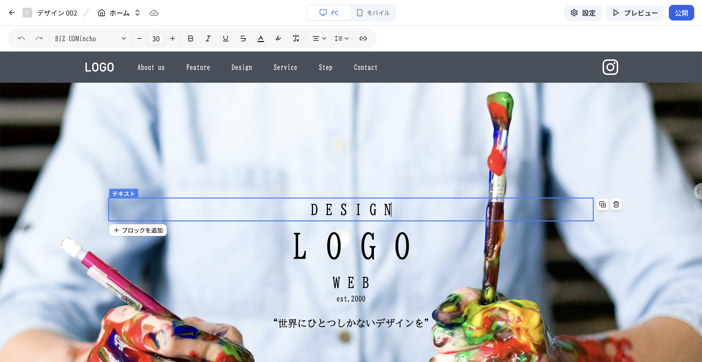 選択したデザインテンプレートの内容を参考に、自社に合わせたロゴ・写真・テキスト・色に変更していきます。足りないコンテンツやページを追加します。